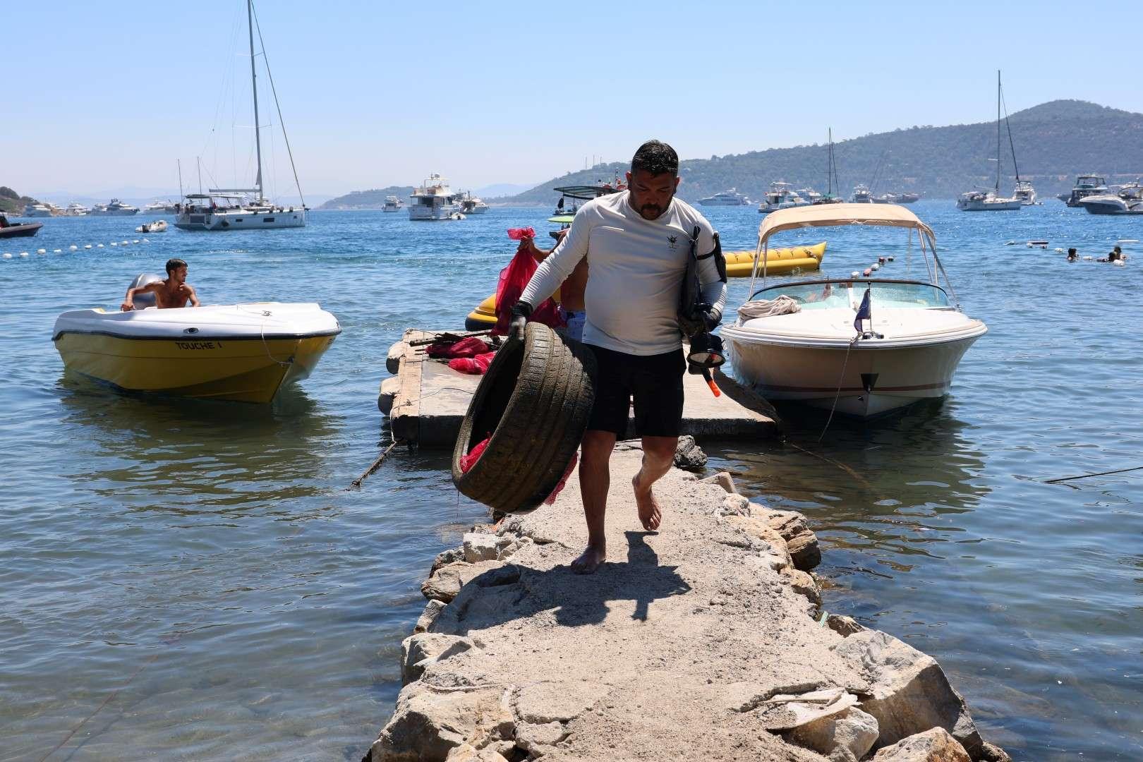 Organized by the Municipality’s Support Services and Senitation Directorates, the cleanup involved a volunteer diving team. The event was attended by Ibrahim Özten, a member of the Bodrum Municipal Council representing Mayor Tamer Mandalinci, as well as Türkbükü Neighborhood Head Yücel Ertuğrul and municipal staff.