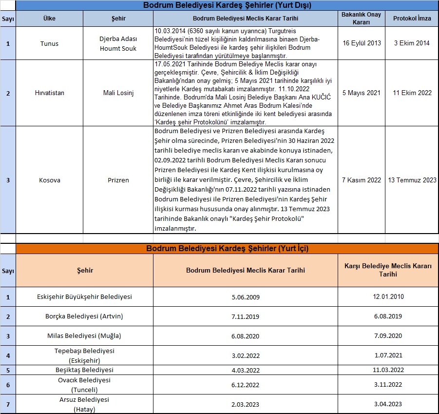 Bodrum Municipality forged Sister City relationships with Eskişehir Metropolitan Municipality on May 6, 2009, Borçka Municipality on July 11, 2019 and Milas Municipality on June 8, 2020, formalized by the respective municipal council decisions. The collaboration with Milas Municipality included joint participation in various international events, tourism fairs, and forums.