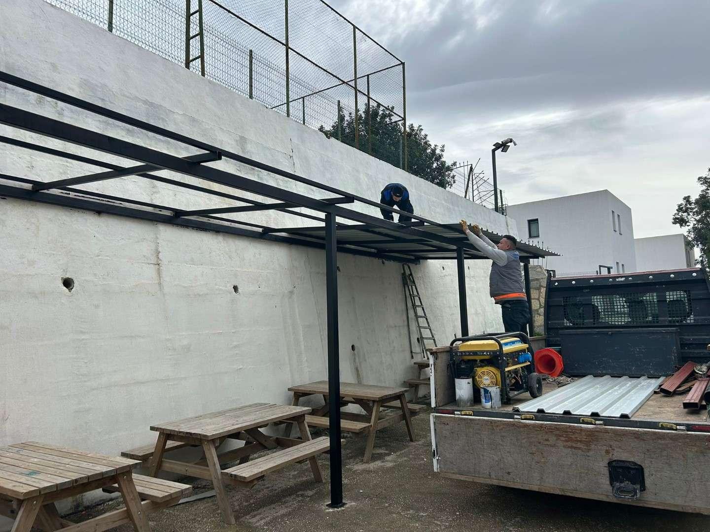 yeni korkuluk demirleri monte edilirken, çatı tamiratı ve yalıtım işlemleri