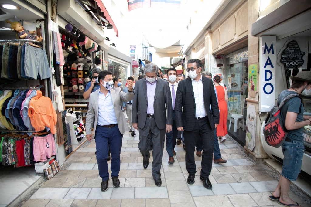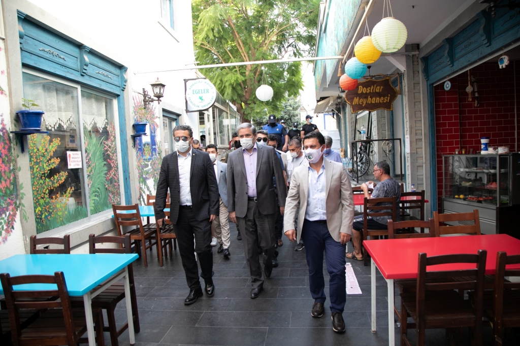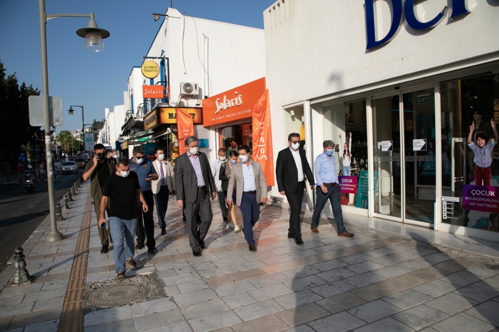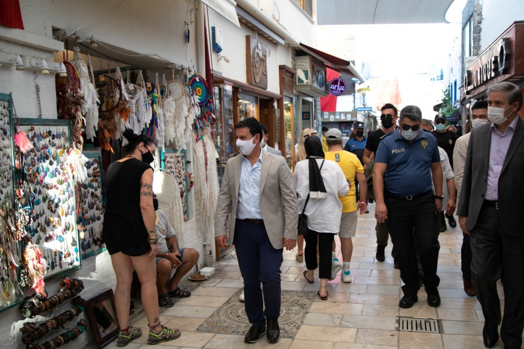 Bu kapsamda Bodrum Kaymakamı Bekir Yılmaz ile Bodrum Belediye Başkanı Ahmet Aras; Cevat Şakir Caddesi, Neyzen Tevfik Caddesi, Dr. Alim Bey Caddesi ve Cumhuriyet Caddesi’nde, başta yeme içme hizmeti veren işletmeler olmak üzere genel denetim gerçekleştirdi. İşletme sahiplerine koronavirüs salgını kapsamında alınması gereken önlemler ve uyulması gereken kurallar konusunda uyarılarda bulunuldu. Bazı işletmelerde masa mesafeleri ölçülerek, girişlerde zorunlu olan ateş ölçer ve maske kullanımı kontrol edildi.