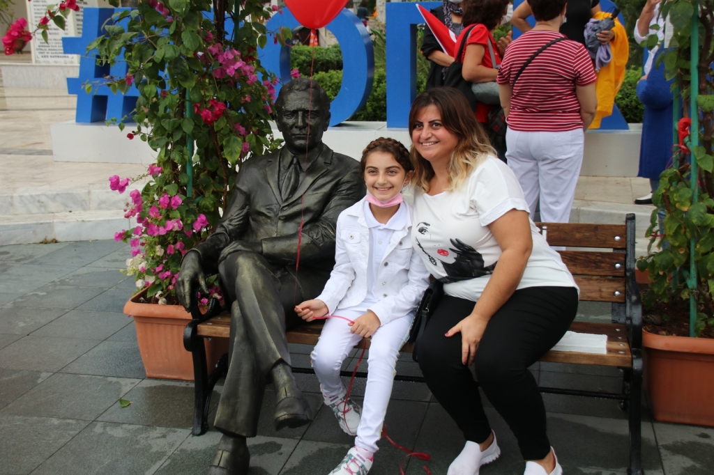 Bugün gerçekleştirilen 29 Ekim Cumhuriyet Bayramı çelenk sunumu programının ardından vatandaşlar, Belediye Meydanı'nda sergilenen banktaki Atatürk heykelinin yanına oturarak hatıra fotoğrafı çektirmek için adeta sıraya girdiler.