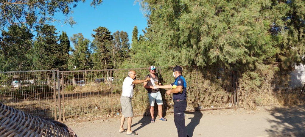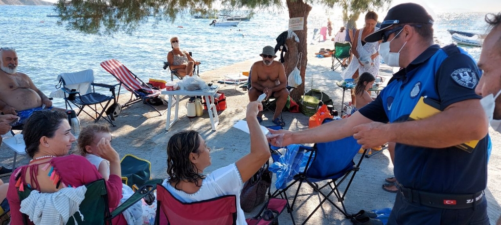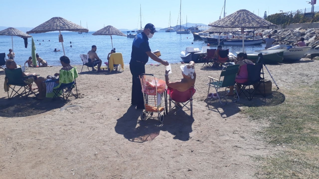 sahillerde maske takmayan vatandaşları uyararak maske dağıtıyor.