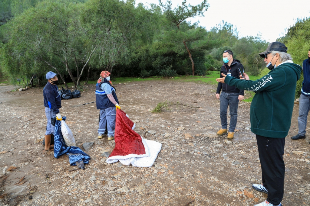 Bodrum Belediyesi Temizlik İşleri Müdürlüğü tarafından, Cennet Koyu’nda kıyı temizliği gerçekleştirildi. Yağan yağmura aldırış etmeden çalışan ekiplere, gazeteci Kenan Erçetingöz de destek verdi. Toplanan atıklar arasında yorgan, yastık ve battaniye gibi eşyaların da bulunması dikkat çekti. Doğaya gelişigüzel atılmış birçok maske ve atık görevliler tarafından toplandı.