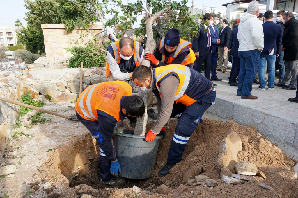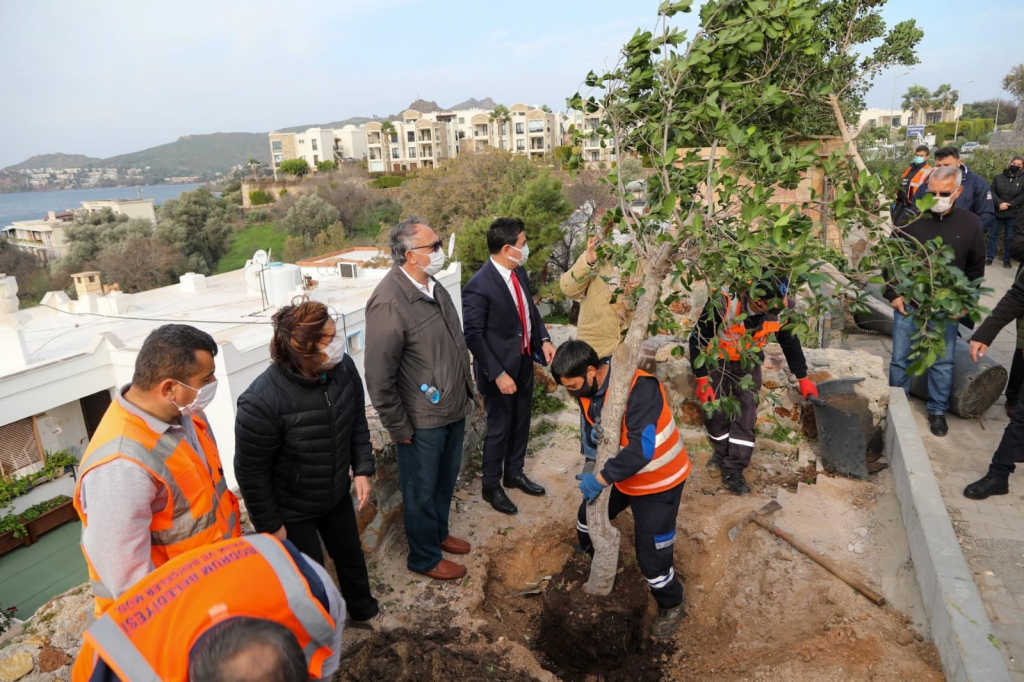Basın açıklamasının ardından Bodrum Belediyesi Park ve Bahçeler Müdürlüğü ekipleri ile birlikte Başkan Aras ve beraberindekiler kesilen ağaçların yerine begonvilleri ve Benjamin ağaçlarını toprakla buluşturdu.