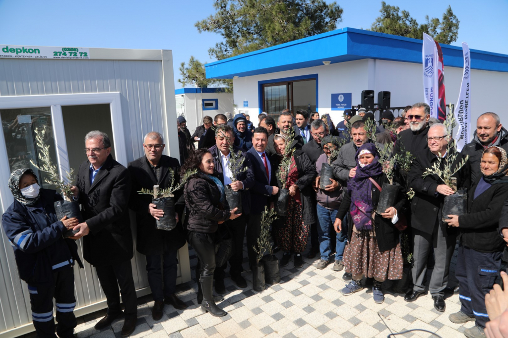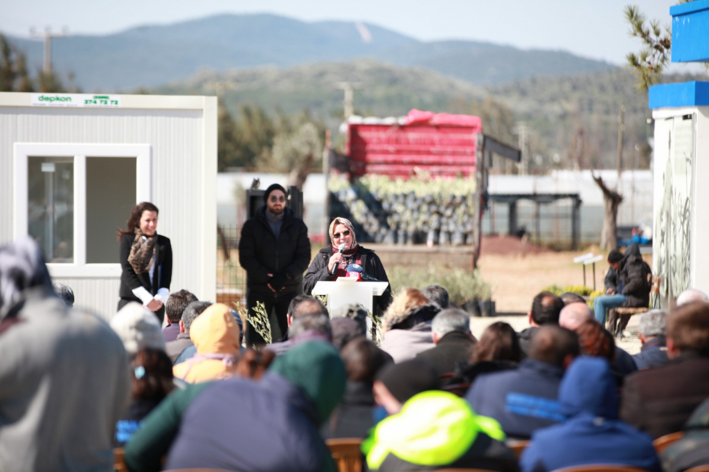 Konuşmaların ardından, konuşmacılar tarafından yangında zarar gören üreticilere zeytin fidanı dağıtımı yapıldı.