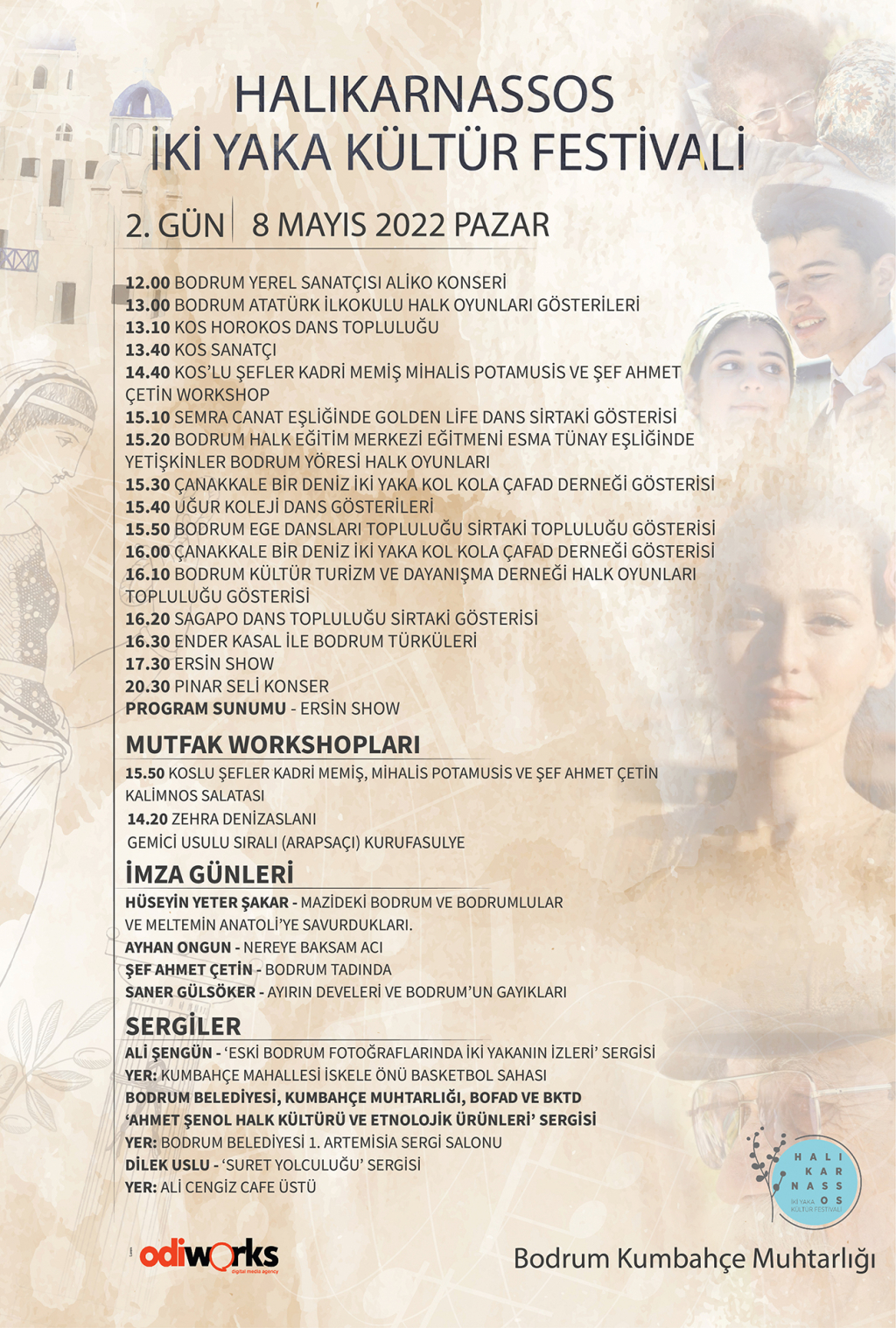 7 Mayıs 2022 Cumartesi günü Bodrum Bandosu ile Belediye Meydanı’ndan Kumbahçe Meydanı’na yürüyüş ile başlayacak olan festival gün içinde gerçekleştirilecek konserler, Kos ve Bodrum dans topluluklarının gösterileri, imza günleri, sergiler ve mutfak atölyeleri ile devam edecek. Gün sonunda Saat 21.30’da Ziynet Sali vereceği konser ile festivale renk katacak.