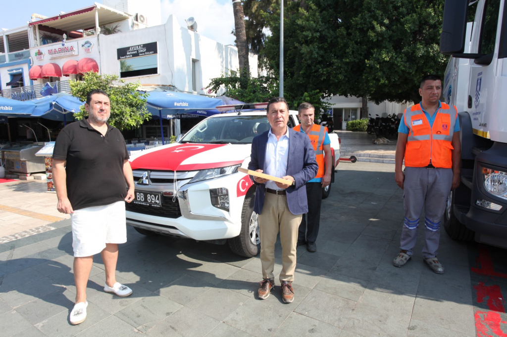 Bodrum’un ilk belediye başkanlarından Dr. Mümtaz Ataman'ın oğlu Ural Ataman tarafından hibe edilen aracın önünde plaketini veren Bodrum Belediye Başkanı Ahmet Aras, Ataman’a ve tüm bağışçılara teşekkür ederek şunları söyledi: