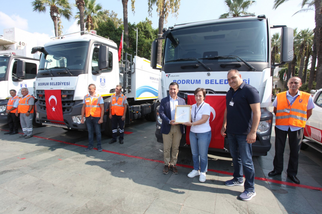 Bodrum Belediyesi’ne bağışlanan araçları hibe eden hayırseverlere, Bodrum Belediye Başkanı Ahmet Aras tarafından teşekkür plaketi verildi.