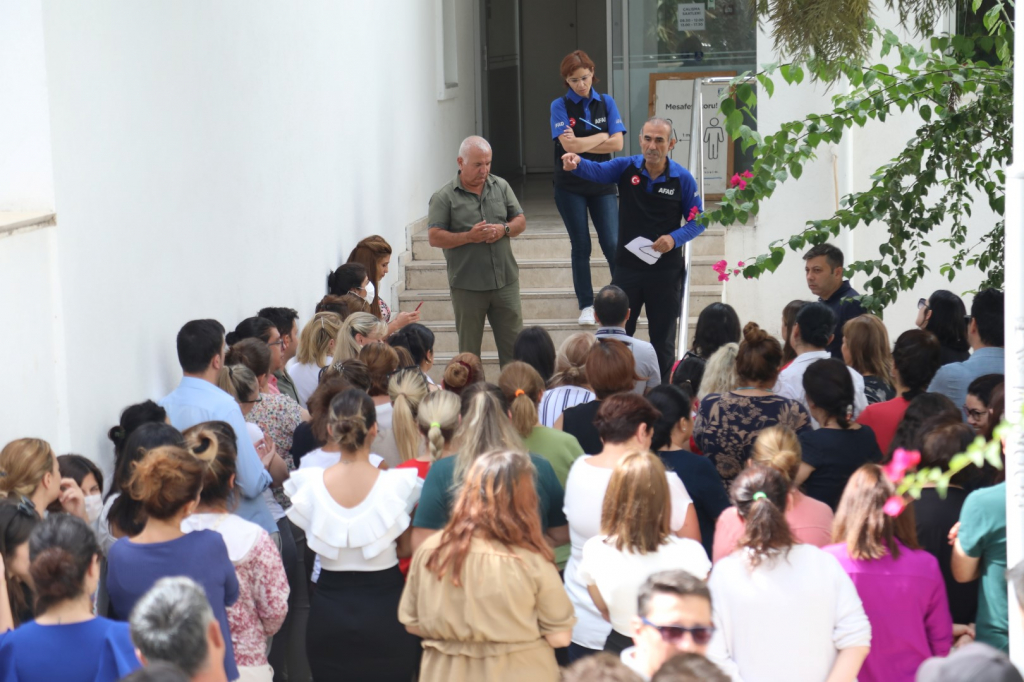 Tatbikat öncesi, deprem anında ve sonrasında yapılması gerekenler hakkında bilgilendirme yapılmasının ardından çalınan sirenle alınan eğitimin uygulamasına geçildi.