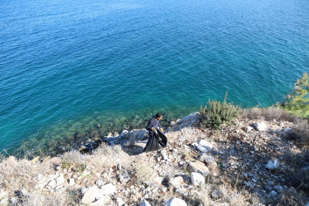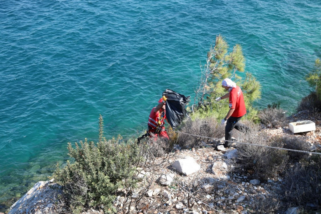 Milas-Bodrum Karayolu Güvercinlik Mahallesi yakınlarındaki Seyir Terasında AKUT’tan 10 gönüllü ve 20 belediye temizlik personeli ile temizlik çalışması gerçekleştirildi. Terastan, yaklaşık 10 metre aşağıya dik ve kayalık bölgeye inen gönüllüler, insan eliyle atılan atık ve çöpleri tek tek topladılar.