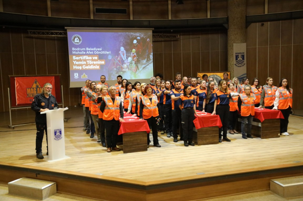 Toplumda afet duyarlılığının gelişmesi, afet öncesinde hazırlıklı olunması ve olası afetlerde meydana gelen olaylarda arama kurtarma çalışmalarına katılması için kurulan Bodrum Belediyesi Mahalle Afet Gönüllüleri ve Acil Müdahale Ekibi (MAG/AME) Yemin Töreni, Herodot Kültür Merkezi’nde gerçekleşti.