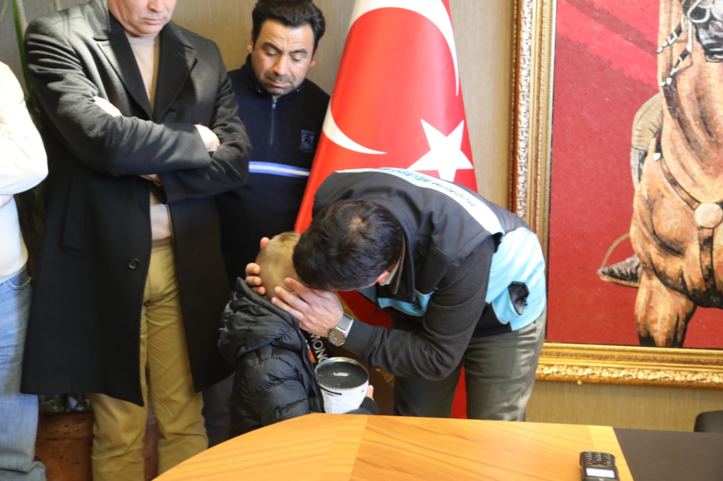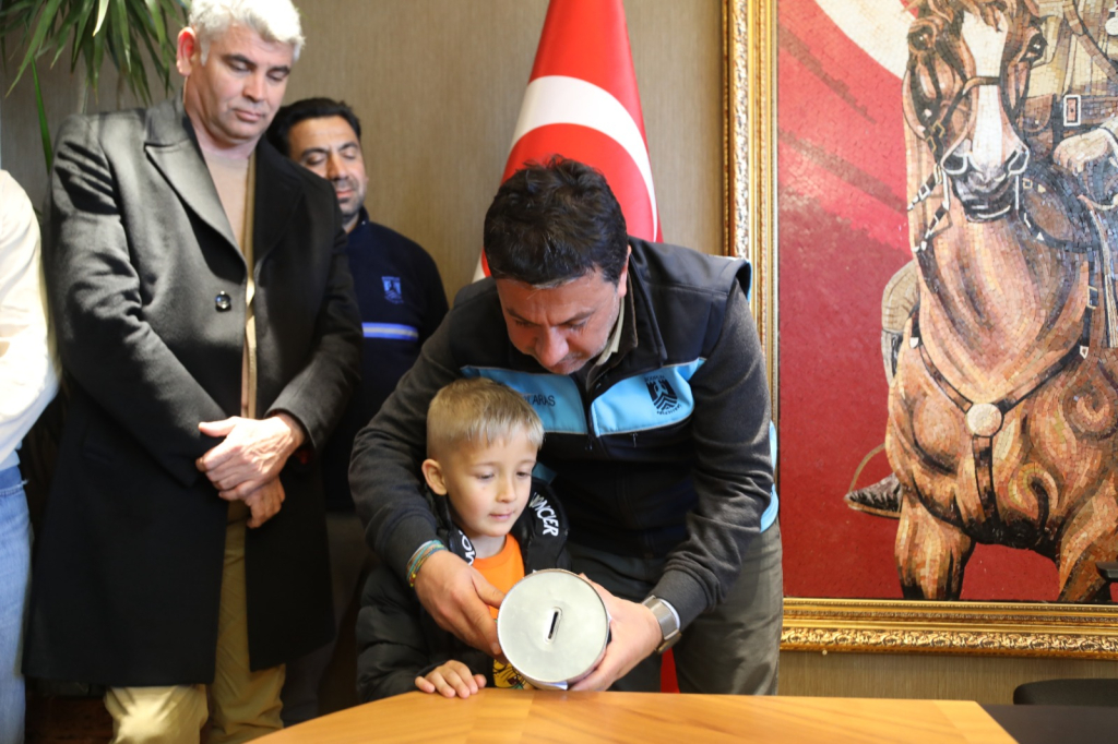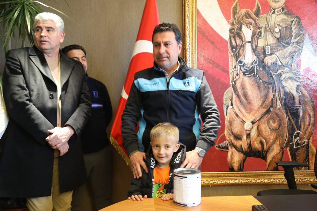 Kumbara üzerinde Mehmet Ege’nin duygularının yazılı olduğu: “Bu benim kumbaram belki içinde çok bir şey yok ama belki bir arkadaşımın yüzünü gülümsetmeye yeter. Bu parayla depremzede bir arkadaşıma oyuncak alın Ahmet Aras amca.” yazısını okuyan Başkan Aras, yaşanan acı felaketin üzerine yaptığı bu anlamlı bağış için Mehmet Ege’ye teşekkür etti.