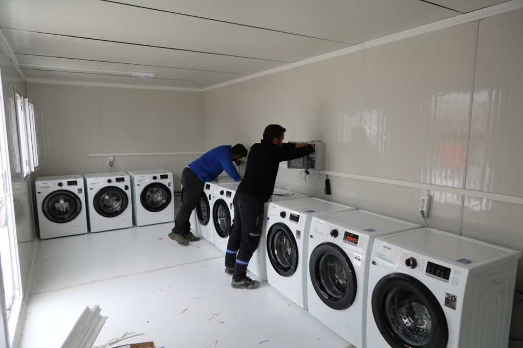 Bin kişinin barındığı Bodrum Belediyesi Hatay-Arsuz Dostluk Kenti’nde günlük ihtiyaçlara yönelik hizmetler kesintisiz devam ederken yardımseverlerin büyük katkısıyla bölgenin en önemli ihtiyaçlarından biri olan çamaşırhane de faaliyete geçirildi.