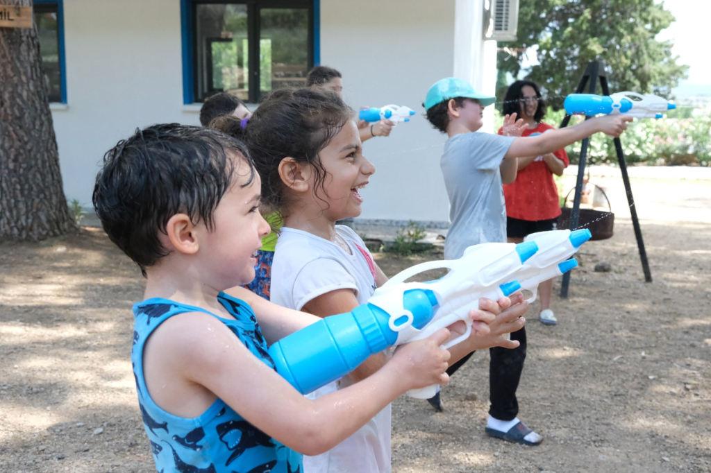 su oyunları oynarken kendilerine dağıtılan su tabancaları ile su savaşı
