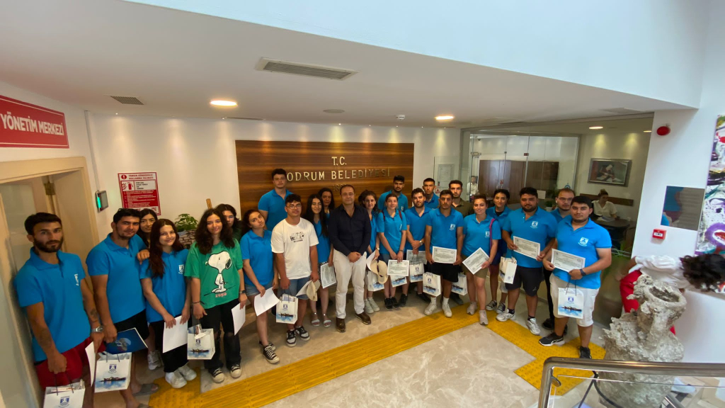 2023 yılı 4’üncü Dönem Gençlik ve Tarım Kampının son gününde Bodrum’daki tarihi ve turistik yerleri gezen öğrenciler, Belediye Başkanı Ahmet Aras’ı makamında ziyaret etti. Kampa nereden katıldıklarını ve kamp sürecinde yaşadıklarını anlatan katılımcılar, Bodrum Belediyesi’ne ve Başkan Ahmet Aras’a teşekkür etti.