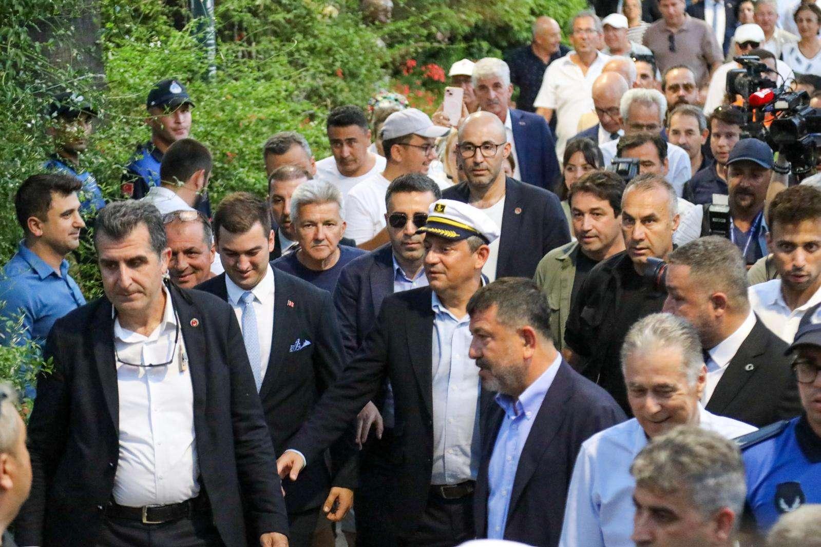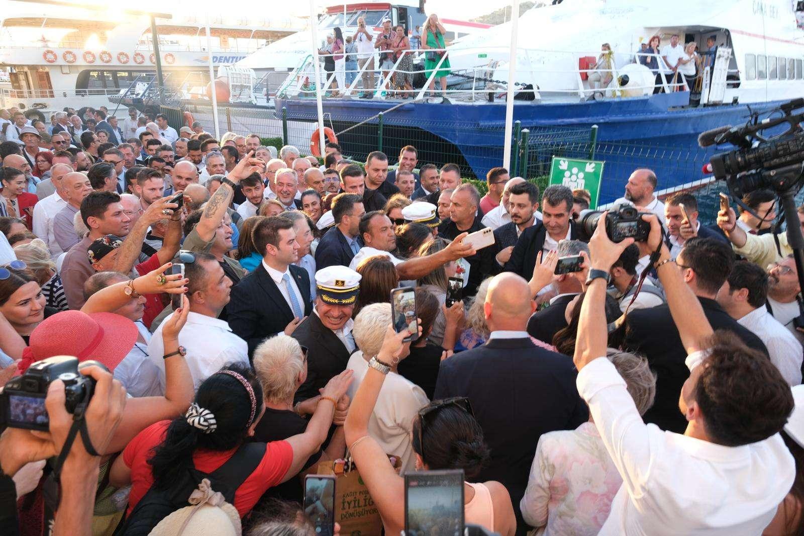 Bodrum Limanında Muğla Büyükşehir Belediyesi ve Bodrum Belediyesi iş birliğiyle karşılama programı düzenlendi. Bodrum Bandosu eşliğinde deniz otobüsünü karşılayan coşkulu kalabalık, CHP Genel Başkanı Özel ile beraberindeki heyete tezahüratlarla CHP ilçe binasına kadar eşlik etti.