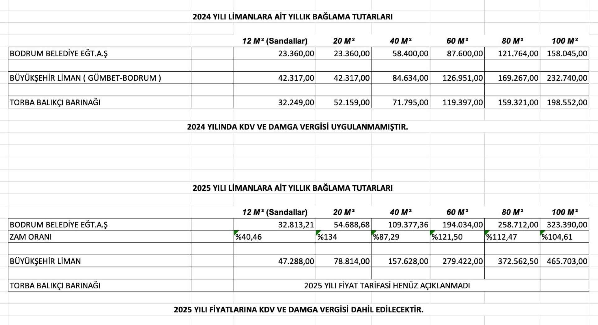 2025 YILI, LİMANLARA AİT YILLIK BAĞLAMA TUTARLARI HAKKINDA