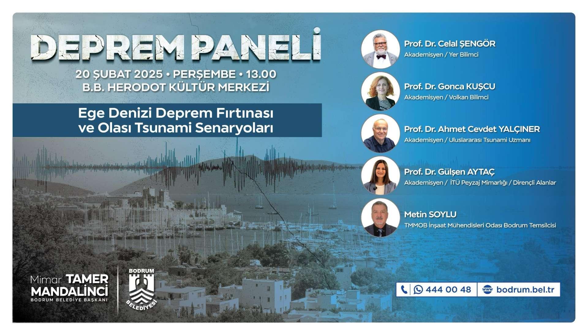 20 Şubat Perşembe günü saat 13.00’te Herodot Kültür Merkezinde “Ege Denizi Deprem Fırtınası ve Olası Tsunami Senaryoları” konulu Deprem Paneli düzenlenecek. Panelde Yer Bilimci Prof. Dr. Celal Şengör, Volkan Bilimci Prof. Dr. Gonca Kuşcu, Uluslararası Tsunami Uzmanı Prof. Dr. Ahmet Cevdet Yalçıner, Peyzaj Mimarı ve Şehir Plancısı Prof. Dr. Gülşen Aytaç ve TMMOB İnşaat Mühendisleri Odası Bodrum Temsilcisi Metin Soylu Ege denizindeki deprem fırtınası ve olası tsunami senaryoları ile ilgili değerlendirmelerde bulunacak.