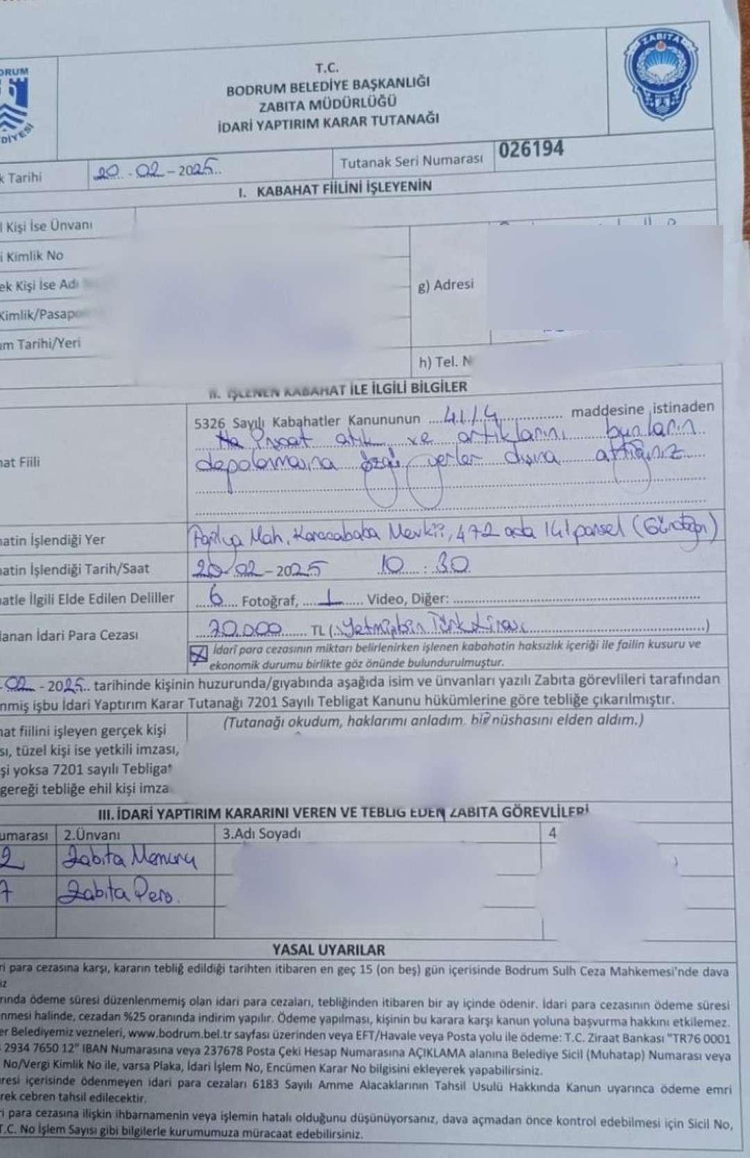 kişiye 5326 sayılı Kabahatler Kanunu’nun 41/4 maddesine istinaden “İnşaat atık