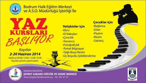 Bodrum Belediyesi, Bodrum Halk Eğitim Merkezi ve ASO Müdürlüğü işbirliğinde düzenlenen yaz kurslarına kayıt yaptırmak isteyenler; 2 – 20 Haziran 2014 tarihleri arasında hafta içi 09.00 - 12.00 / 13.00 - 16.00 saatleri arasında, Bodrum’un Turgutreis Mahallesi’nde yer alan Şevket Sabancı Kültür Merkezi’nde şahsen müracaat ederek kaydını yaptırabilir. 18 yaşından küçük çocuk ve gençler ise kayıtlarını velileriyle birlikte yaptırabilecek.