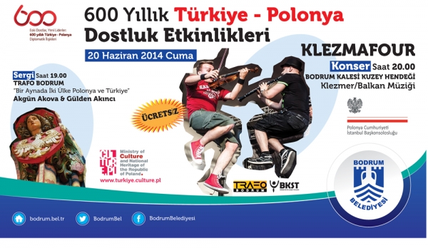 600 yıllık Türkiye - Polonya Dostluk Etkinlikleri kapsamında Bodrum Belediyesi’nin destekleriyle Polonya Cumhuriyeti İstanbul Başkonsolosluğu ile Bodrum Kültür ve Sanat Topluluğu (BKST) işbirliğinde Bodrum’da bir dizi etkinlik düzenleniyor. 20 Haziran Cuma günü Bodrum’da gerçekleşecek etkinlikler kapsamında Polonya - Türkiye dostluk ilişkileriyle ilgili sergi açılışı ve Polonyalı Müzik Grubu Klezmafour tarafından geleneksel Klezmer/Balkan Müziği konseri verilecek.