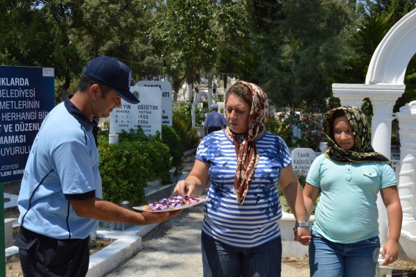 Bodrum Belediyesi Mezarlıklar Müdürlüğü ekipleri, mezarlıkları ziyaret eden yakınlarını kaybetmiş vatandaşlara kolonya ve şeker ikramları yaparak bayramlarını kutladı.