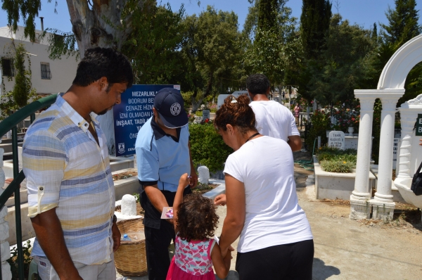 Ramazan Bayramı nedeniyle Bodrum Belediyesi Mezarlık Müdürlüğü ekipleri tarafından Bodrum genelindeki mezarlıklarda vatandaşlara kolonya ve şeker ikram edildi. İlk kez bu yıl gerçekleştirilen uygulama, Ramazan Bayramı arifesinde mezarlıkları ziyaret eden, yakınlarını kaybetmiş vatandaşlara moral oldu. Ekipler, kaybettikleri yakınlarına dua etmek için mezarlık ziyareti yapan vatandaşlara kolonya ve şeker ikramı yaptıktan sonra bayramlarını kutladı.