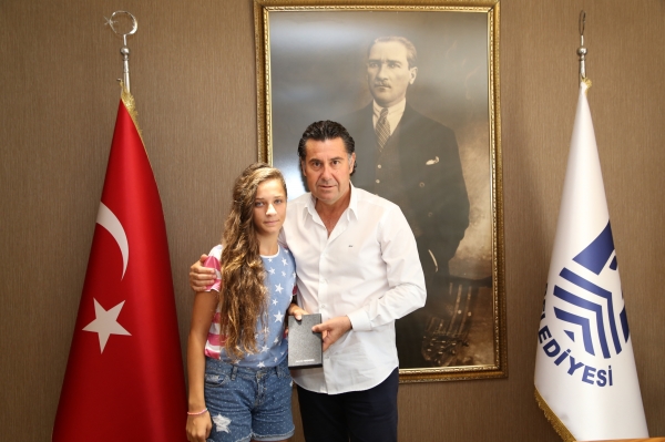 2013-2014 Eğitim-Öğretim Yılı Okullar Arası Küçükler ve Yıldızlar Puanlı Atletizm Birincisi Yağmur Gözleyen, Bodrum Belediye Başkanı Mehmet Kocadon'u makamında ziyaret etti.