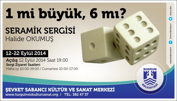 Seramik sanatçısı Halide Okumuş'un "1 mi büyük 6 mı?" adlı seramik sergisi, 12 Eylül'de Bodrum Belediyesi Şevket Sabancı Kültür ve Sanat Merkezi'nde görücüye çıkıyor. Sergi, 22 Eylül'e kadar hafta içi 10.00 - 19.00, Cumartesi günleri ise 10.00 - 17.00 saatleri arasında görülebilecek.