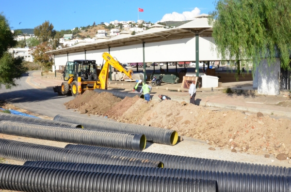 Bodrum Belediyesi ekipleri, yaklaşan kış ayları öncesi ilçe genelinde başlattıkları yağmur sularına karşı önlemlerine hız kesmeden devam ediyor. Yağmur sularından etkilenen kapalı pazar yerinde sorunun çözülmesi için çalışan ekipler, toplam 350 metre alan boyunca 500'lük yağmur suyu drenaj borusu döşeme çalışmalarına başladı. Yapılan çalışmaların ardından yağmur sularının yoğun olarak toplanarak gölet oluşturduğu yerlerde konulan mazgallarla yer altına alınacak olan su, pazar yerinin hemen yanına döşenen drenaj borularıyla tahliye edilecek.