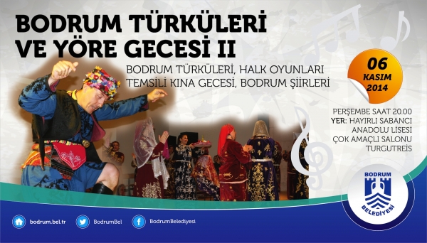 Bodrum Belediyesi Kültür ve Sosyal İşler Müdürlüğü, geçen yıl ilki gerçekleştirilen "Bodrum Türküleri ve Yöre Gecesi'nin" ikincisini 06 Kasım Perşembe günü saat: 20.00'da Turgutreis Hayırlı Sabancı Anadolu Lisesi Çok Amaçlı Salonunda gerçekleştirecek. Bodrum'un kültürel değerlerini yaşatmak amacıyla düzenlenen etkinliğe Turgutreis Halk Ozanı Erol Özkaplan ile Bodrumlu Eczacı Yücel Ziylan da destek veriyor. Etkinliğe Bodrum'un kardeş şehri olan Tunus Djerba Adası Houmt Souk Belediyesi Kardeş Şehir heyeti de katılarak Bodrum ve kendi kültürleri arasında bir bağ kuracak.