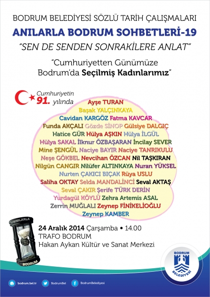 24 Aralık 2014 Çarşamba günü saat 14.00’de Trafo Bodrum Hakan Aykan Kültür ve Sanat Merkezi’ndeki sohbette Bodrum’un seçilmiş kadınları anılarını Bodrumlularla paylaşacak.