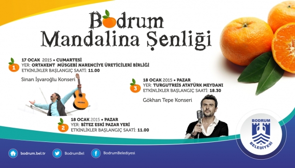 Bodrum’un yerel değeri mandalinanın yaşatılması için Bodrum Belediyesi tarafından düzenlenen Bodrum Mandalina Şenliği, Bodrum’un Ortakent, Bitez ve Turgutreis mahallelerinde gerçekleştirilecek olan çeşitli etkinliklerle kutlanacak. Etkinlikler kapsamında 18 Ocak Pazar günü akşam saat 19.30’da ise ünlü sanatçı Gökhan Tepe, sevilen şarkılarıyla Turgutreis Atatürk Meydanı’nda düzenlenen konserde sahne alacak. Hafta sonu sabah saatlerinden itibaren başlayacak olan etkinliklerde çeşitli yarışma ve gösteriler de yer alacak.