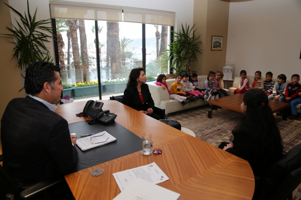 Bodrum Belediye Başkanı Mehmet Kocadon’u makamında ziyaret eden minik öğrenciler, Başkan Kocadon’la sohbet etti.