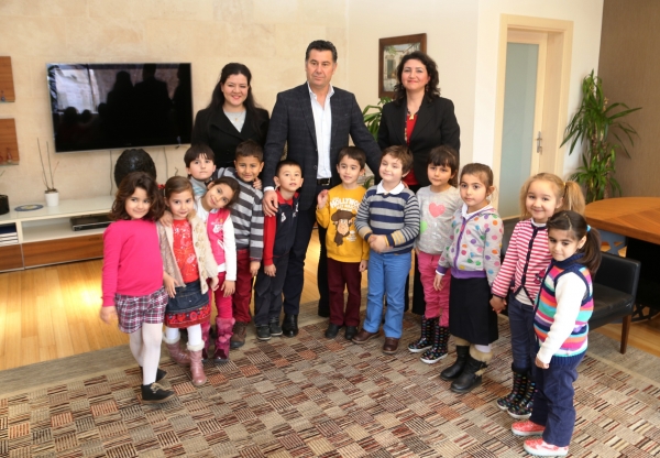 MİNİK ÖĞRENCİLER, BAŞKAN KOCADON İLE MAKAMINDA BİR ARAYA GELDİ