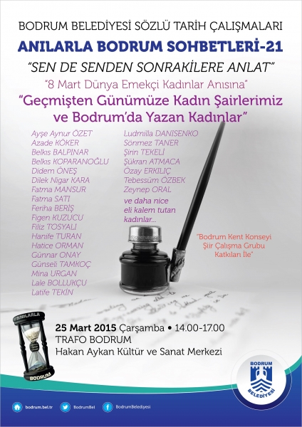 Bodrum Belediyesi Kent Konseyi Sözlü Tarih Çalışmaları ‘Anılarla Bodrum Sohbetleri’ Gönüllü Çalışma Grubu tarafından düzenlenen sohbet toplantıları, Mart ayı programı ile devam ediyor. Bodrum’da yaşamış ve Bodrumlu kadın yazar ve şairlerin katılımıyla yapılacak olan ‘Geçmişten Günümüze Kadın Şairler ve Bodrum’da Yazan Kadınlar’ konulu sohbet toplantısı, 25 Mart Çarşamba günü saat 14.00’te Trafo Bodrum A.Hakan Aykan Kültür ve Sanat Merkezi’nde gerçekleştirilecek.