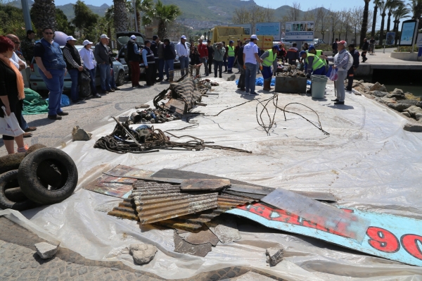 Atıkları taşımak üzere iki teknenin görev aldığı etkinlikte dalgıçlar, çalışmalarına, Turgutreis Sabancı Parkı’nın bulunduğu sahil bölgesinden başladı. Öğle saatlerine kadar süren çalışmaların ardından dalgıç ekibi bu sefer Turgutreis Limanı ve Günbatımı Plajı’na geçti. Çalışmalar kapsamında deniz dibinden çıkarılan çok sayıda araç lastiği, cam şişeler, süper market arabaları, işyeri tabelaları ve hurda malzemelerden oluşan çeşitli atıklar görenleri hayrete düşürdü.