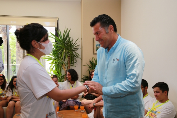 Gençler, Başkan Kocadon'a LÖSEV rozeti takarken Başkan Kocadon da öğrencilere hediye verdi.