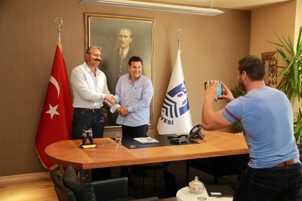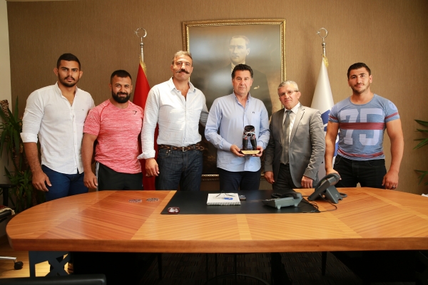 Güreş Baş Antrenörü ve Kırkpınar Hakemi Milli Güreşçi Halil Öz ve beraberindeki pehlivanlar, Bodrum Belediye Başkanı Mehmet Kocadon’u makamında ziyaret eti.