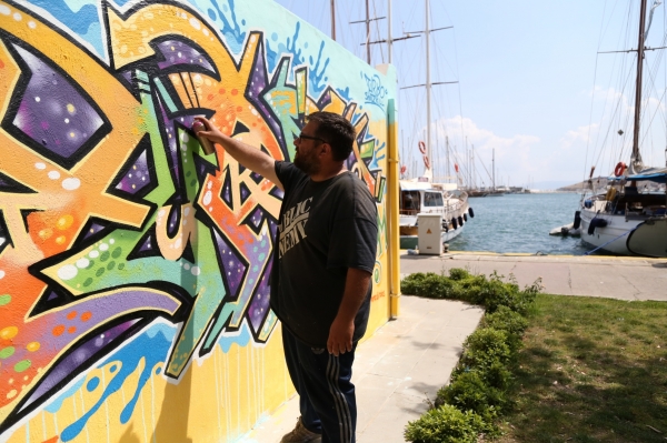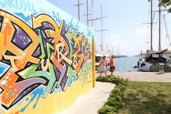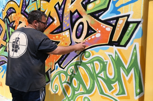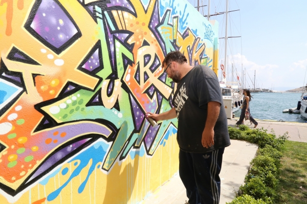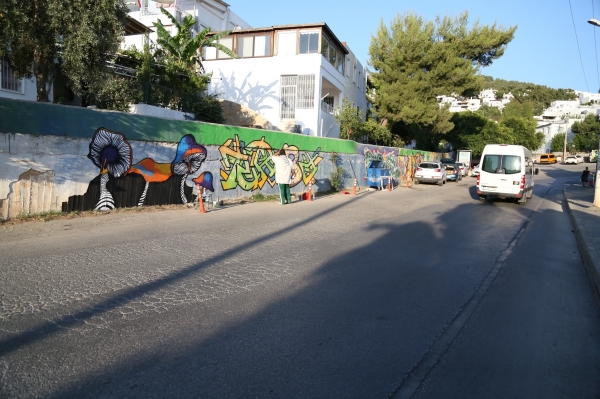 Bodrum Belediyesinin destekleriyle sanatçılar tarafından uygulanan “Graffiti” çalışmalarını yerinde inceleyen Başkan Mehmet Kocadon, “Bodrum renkli yaşayan bir yer. Renkler aynı zamanda özgürlüğün de birer simgesidir.” dedi.