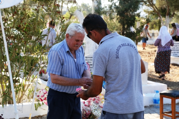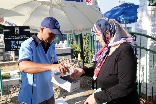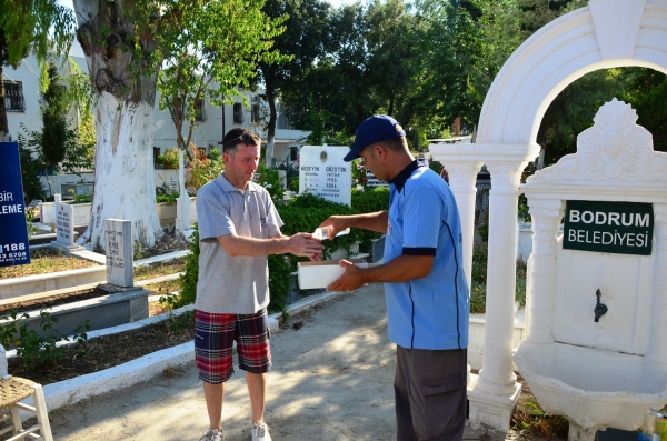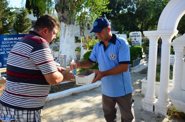 Bodrum Belediyesi Cenaze Hizmetleri Birimi, Ramazan Bayramı nedeniyle Bodrum Belediyesine bağlı mezarlıklarda bayram şekeri ve kolonya ikramlarında bulundu.