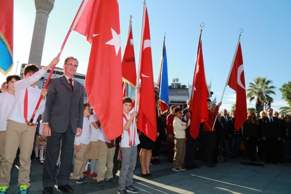 Atatürk anıtının önüne çelenk sunumunun ardından Mustafa Kemal Atatürk'ün hayata gözlerini yumduğu 9.05’te, sirenler eşliğinde iki dakikalık saygı duruşunda bulunularak İstiklal Marşı okundu.