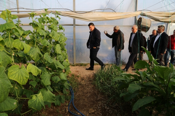 Fikir alışverişinde bulunulan sohbet toplantısının ardından Başkan Kocadon ve beraberindekiler, toplam yedi dönümlük iki serayı gezerek yetişen ürünleri inceledi.