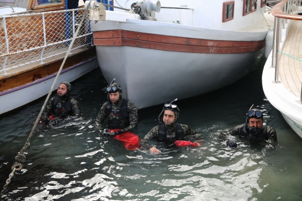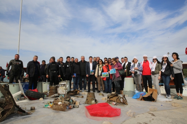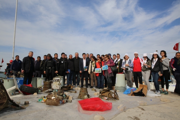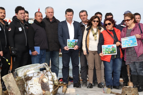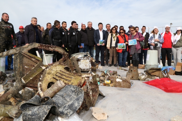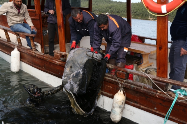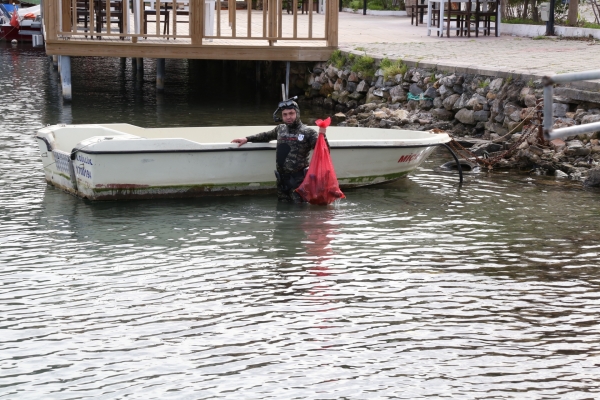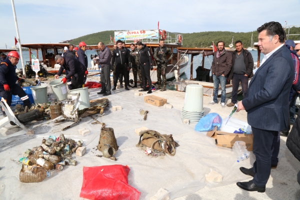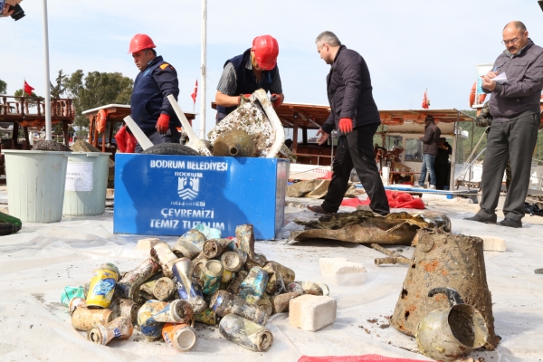 Bodrum Belediyesi Dalış Ekibi tarafından gerçekleştirilen çalışmalarda denizden çok sayıda cam şişe, plastik malzeme ve araç lastiklerinin yanı sıra yatak, çaydanlık, batık sandal ve koltuk değneği gibi nesneler de çıkarıldı.