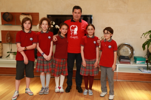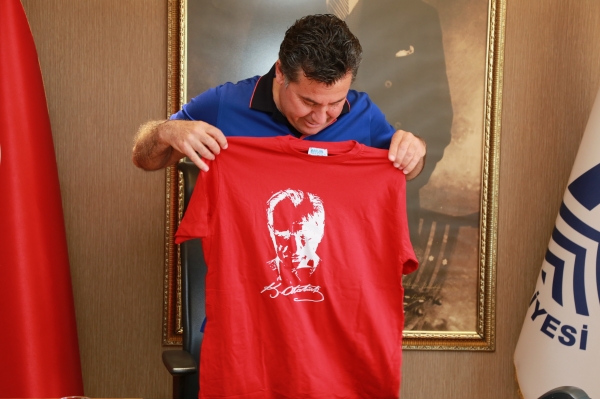 Okul öğrencileri, Başkan Kocadon’a Atatürk baskılı bir t-shirt ile çiçek hediye etti. Başkan, teşekkür ederek tişörtü giydi ve öğrencilerle sohbetine Atatürk tişörtüyle devam etti.
