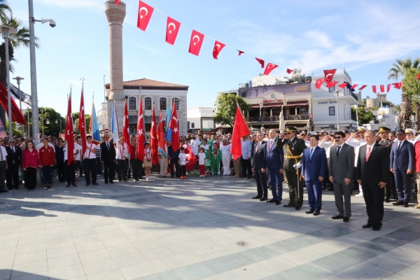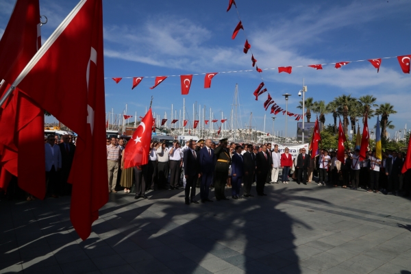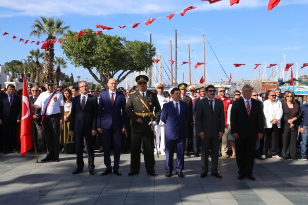 Bodrum Belediye Meydanı'ndaki Atatürk Anıtı önünde düzenlenen törene Bodrum Kaymakamı Dr. Mehmet Gödekmerdan, Bodrum Belediye Başkan Vekili Niyazi Atare, Bodrum Belediye Başkan Yardımcısı Taner Uslu, Cumhuriyet Başsavcısı Dr. Barış Duman, Bodrum Ağır Ceza Mahkemesi Başkanı Hakim Dr. Yakup Yıldız, Garnizon Komutanı Albay Atilla Göksel Oral, Aksaz 2. Muhrip Filotillası Komodoru Dn. Kur. Alb. Aykar Tekin, Gençlik ve Spor İlçe Müdürü Fatih Uzunlulu ile siyasi parti ve çeşitli sivil toplum kuruluşu temsilcileri, okul idarecileri, öğretmenler ve öğrenciler katıldı.