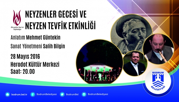 Bodrum Belediyesi ve Bodrum Ticaret Odası tarafından Bodrum Belediyesi Herodot Kültür Merkezi’nde gerçekleştirilecek olan etkinlik, Hezarfen Sanat Topluluğundan Mehmet Güntekin’in anlatımı ve Salih Bilgin’in yönetmenliğinde gerçekleşecek. Bodrum ile bütünleşmiş, Bodrum doğumlu ünlü neyzen ve şair Neyzen Tevfik’in de anılacağı etkinlikte, gece boyunca neyin büyülü tınıları, izlemeye gelenleri mest ederek kulaklarının pasını silecek.