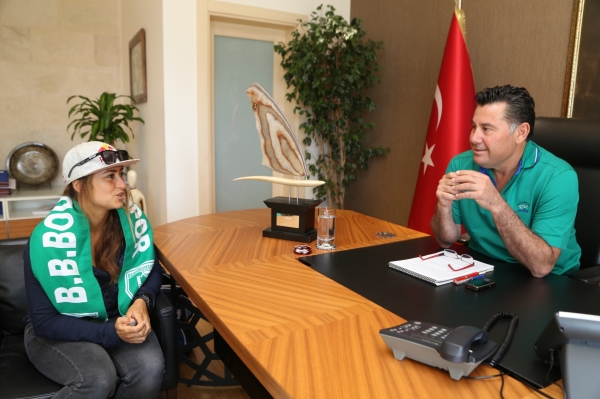 2016 PWA Dünya Turu’nun ilk ayak yarışını kazanarak Dünya 1.'liği koltuğuna oturan Bodrumlu sörfçü Lena Aylin Erdil, Bodrum Belediye Başkanı Mehmet Kocadon'u ziyaret etti.