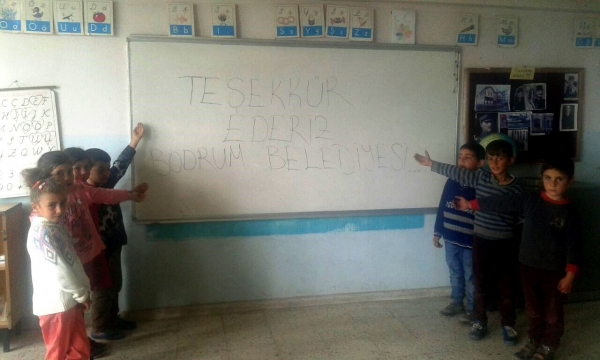 Yardımlardan dolayı büyük mutluluk duyan okul öğrencileri, büyük puntolarla “Teşekkür Ederiz Bodrum Belediyesi” yazdıkları sınıf tahtasının etrafında toplanıp fotoğraf çekilerek, fotoğrafı da Bodrum Belediyesi’nin mail adresine gönderdi.