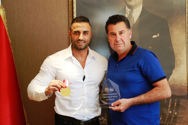 Londra'daki O2 Arena'da "WBFF Muscle Model"de birinci olan milli sporcu Ersen Öznesil, Bodrum Belediye Başkanı Mehmet Kocadon'u makamında ziyaret etti.